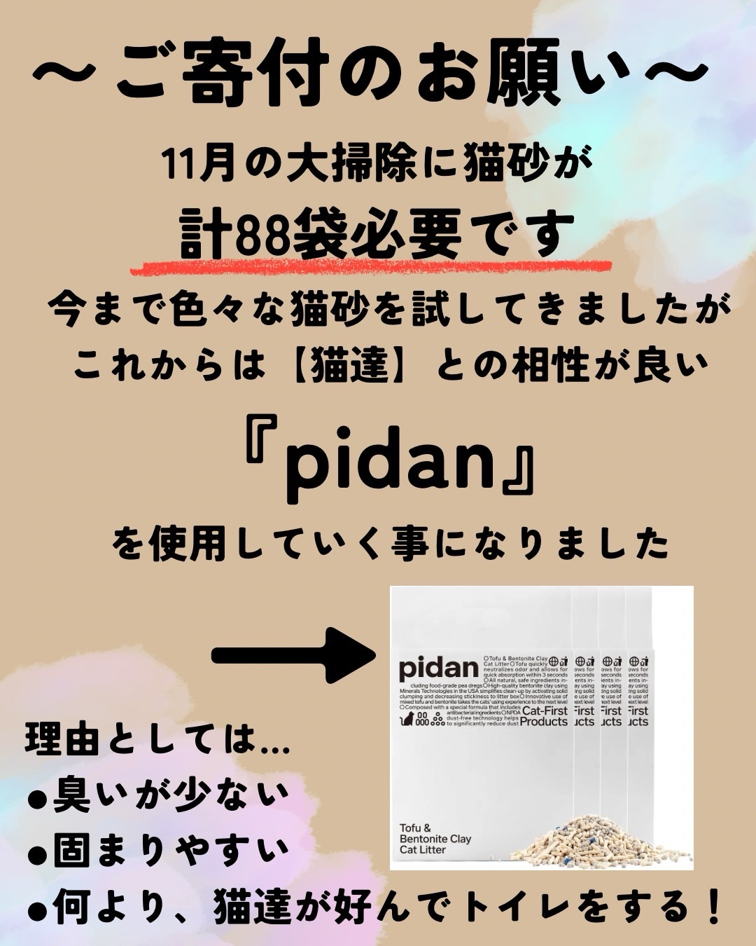 毎月のご支援金で月に2回の大掃除に必要な物資の購入や避妊・去勢手術などの高額になる支出の時に充当させていただいております。