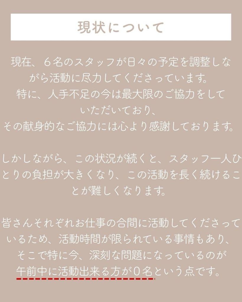 しかしながら、依然として午前中を担当していただけるスタッフが少ないため、現在は主にわたしが午前の部を担当し、既存のスタッフさんたちが自身の仕事時間を調整し、何とかやりくりしているのが現状です。