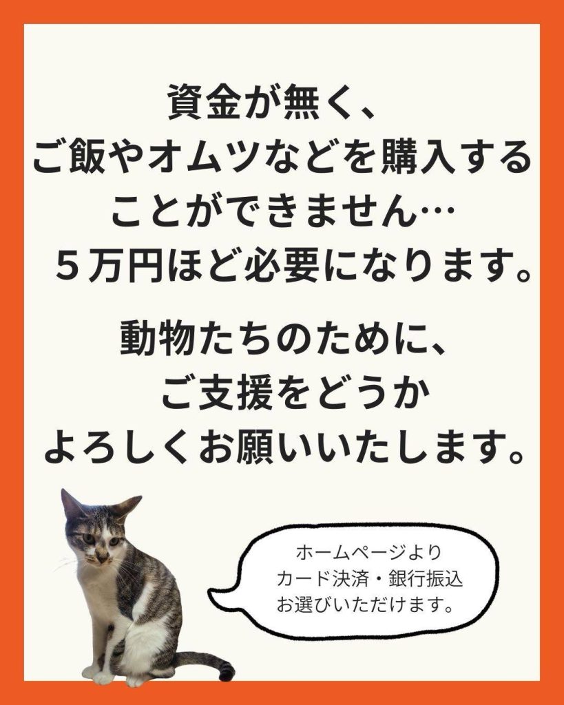 資金不足により、このままでは動物たちのご飯やオムツなどの日用品を購入することができません。