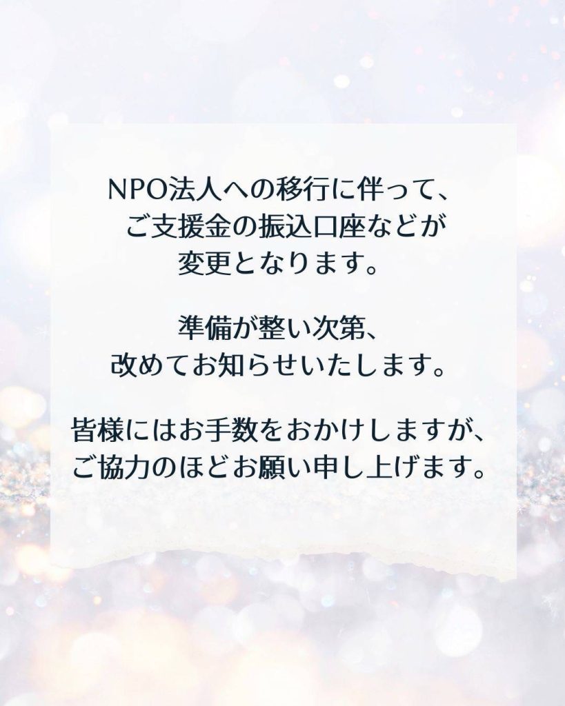 NPO法人への移行に伴ってご支援金の振込口座が変更になります。