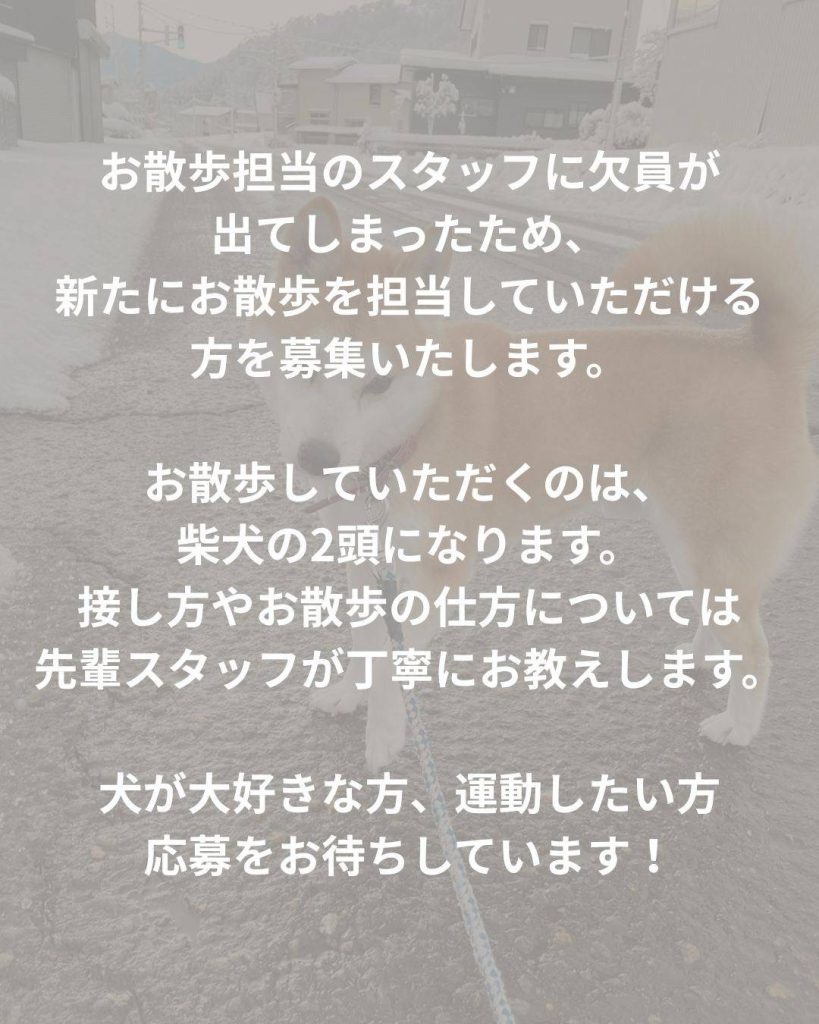 スタッフの欠員につき、新たにお散歩を担当してくださる方を募集いたします。
